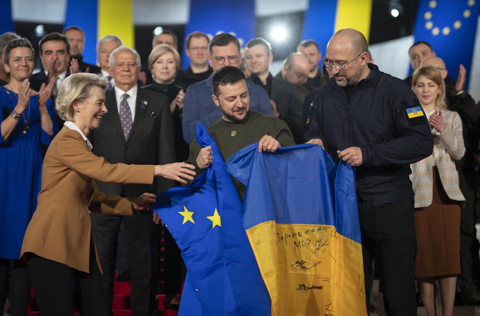 «No debemos olvidar que estamos aquí, en un país que está en plena guerra, defendiéndose de una agresión y un agresor brutales, y que estamos debatiendo juntos nuestro futuro común», indicó Von der Leyen en una rueda de prensa al término del primer encuentro en la historia entre el Colegio de comisarios europeos y el Gobierno ucraniano.