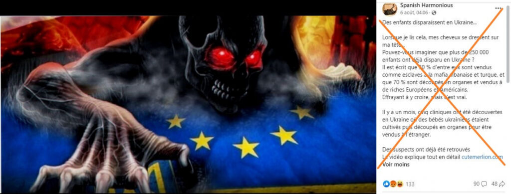 Aux côtés d’un visuel montrant une créature diabolique ramper sur un drapeau aux couleurs conjointes de l’Union européenne et de l’Ukraine, ce message affirme que, parmi ces 250.000 enfants disparus, « 30 % » sont « vendus comme esclaves à la mafia albanaise et turque » et « 70 % […] découpés en organes [sic] et vendus à de riches Européens et Américains.«