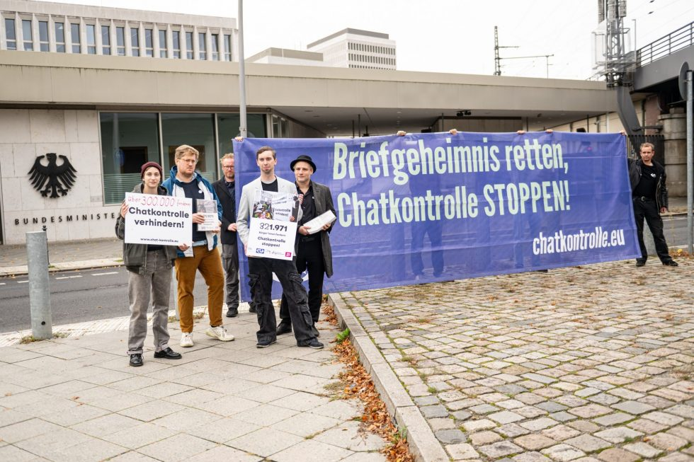 Berlin, le 9 octobre 2025 : des membres de l’alliance « Stop au contrôle des conversations ! » manifestent devant le ministère fédéral de l’Intérieur. (Photo : Fabian Sommer/dpa)