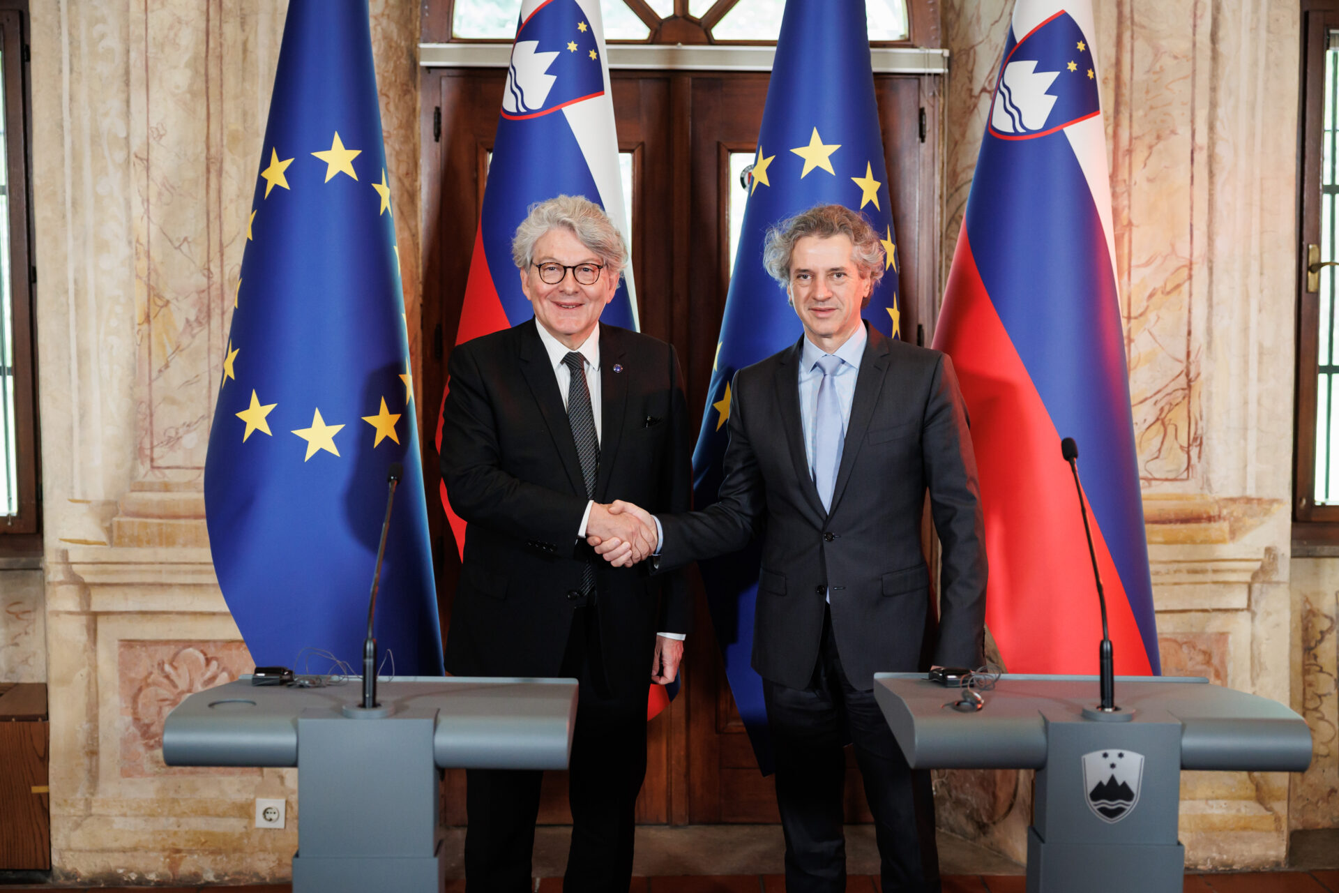 Vipava – Premier Robert Golob se je na dvorcu Zemono v četrtek srečal z evropskim komisarjem za notranji trg Thierryjem Bretonom. Na srečanju, ki sta se ga udeležila tudi ministra za obrambo in gospodarstvo, Marjan Šarec in Matjaž Han, so govorili o krepitvi evropske obrambne industrije in slovenski vlogi pri tem, pa tudi o pomenu jedrske energije za zeleni prehod.